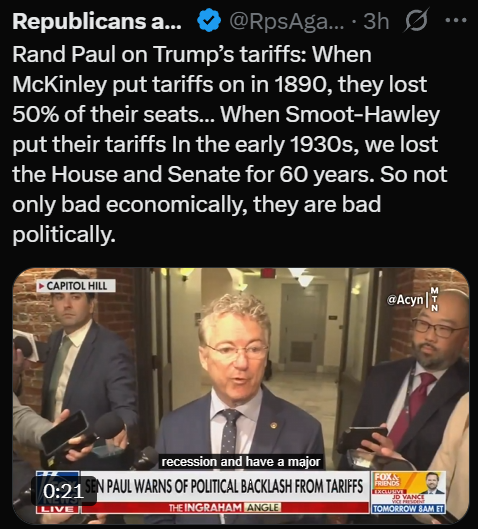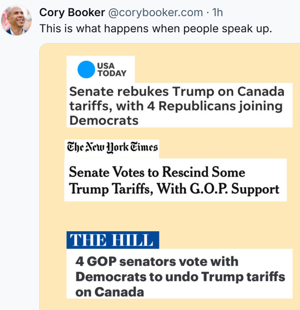 But hear Me now: this is not the end. Already, some Republicans are breaking ranks. Just yesterday the Senate voted to undo the tariffs on Canada.