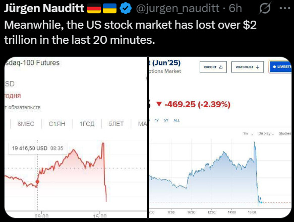 Donold waited until markets closed to make his announcement, but that didn’t stop global economies from crashing in after hours trading. The Dow dropped $2 trillion in 20 minutes.