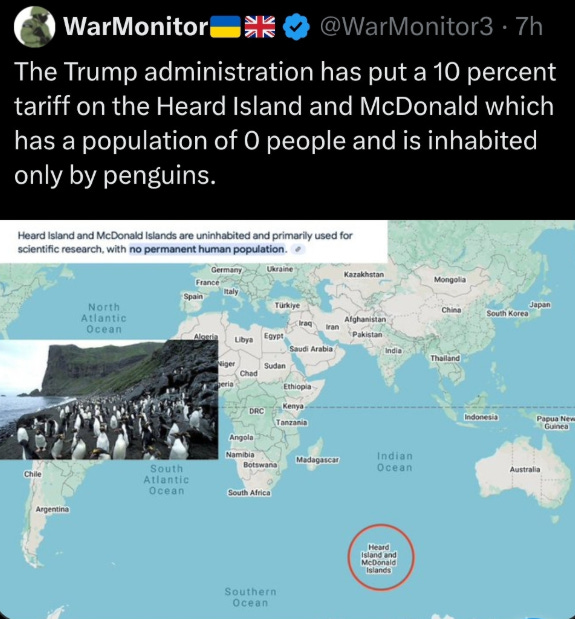 He’s got a US military base on the list of places to tariff. He’s also got an island primarly populated by penguins. BUT do you know who wasn’t on the list of countries hit with tariffs? Russia! Gee, I wonder why?