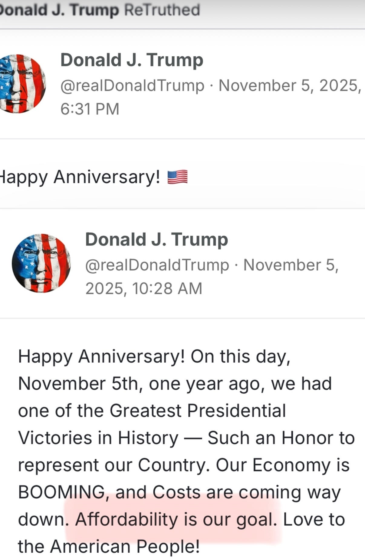 Hey, he wants to make things more affordable? Alright Pudding Pants, go tell your boys Thune and Johnson to agree to the ACA subsidies so people can afford their insurance. Then kill all of your tariffs so people can afford the things they need and house and car insurance goes down. Tick Tock King Jellybean.