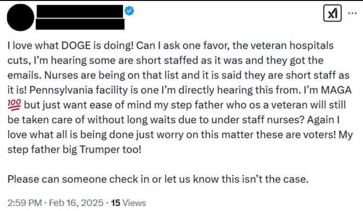 A Big Trumper™ posted that they LOVE what DOGE (the Department of Government Efficiency) is doing—except oopsie! it’s cutting too much! Specifically, their very MAGA stepfather might face longer wait times at VA hospitals due to nurse shortages.