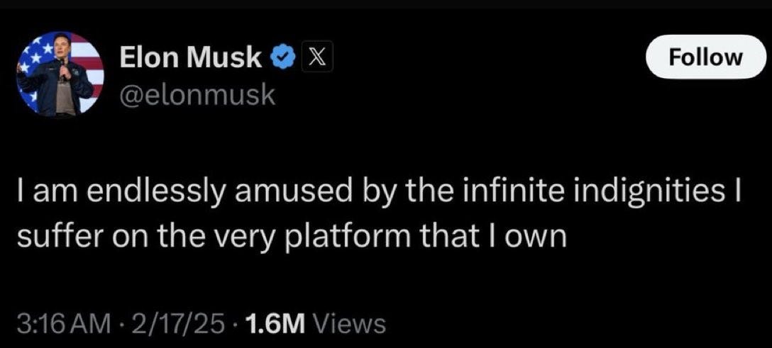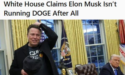 Unfortunately for Big Trumper™, Elon Musk has problems of his own. He’s not even the manager of DOGE! No, seriously.