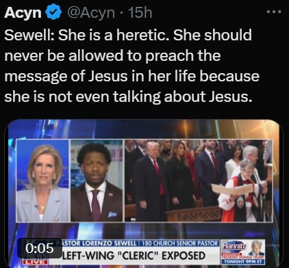 Predictably, the MAGA media machine went into overdrive. On The Ingraham Angle, 'Pastor Lorenzo Sewell labeled Budde a “heretic” for daring to preach love, mercy, and compassion.
