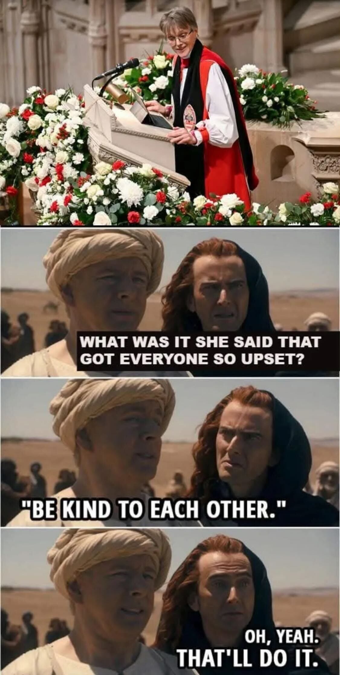 Donold, thou art the whiniest, smallest man who ever lived. First, thou couldst not handle the cold; now thou canst not handle a bishop’s sermon. Thy fragile ego doth demand apologies like a toddler demands snacks—but lo, thou shalt not receive one.