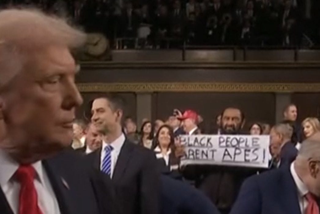 That sign is referencing the horrifyingly racist AI video President Convicted Felon Trump posted about beloved former president Barack Obama and First Lady Michelle Obama just a week ago.