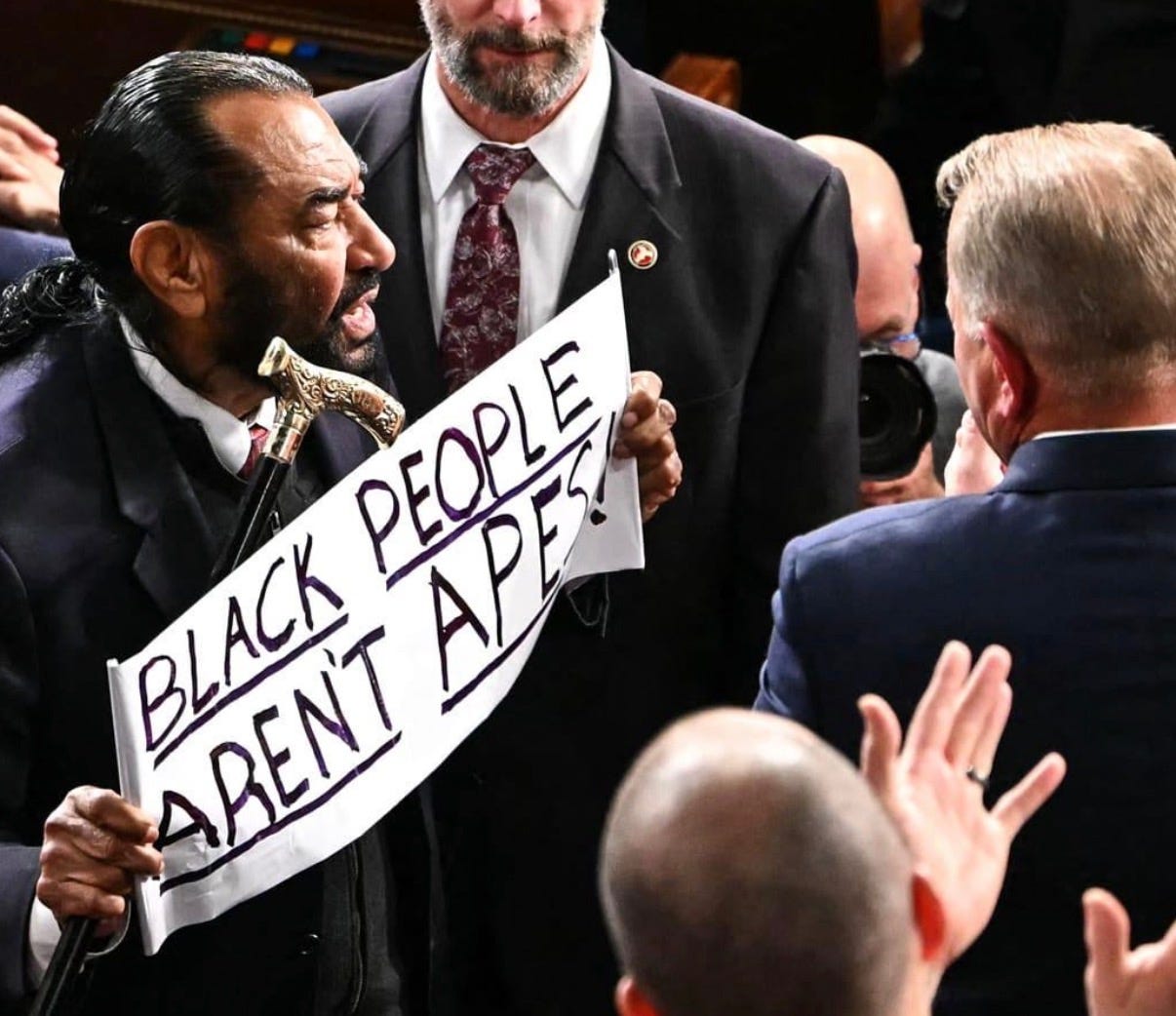 As Donald waddled by, Al Green held up a sign that says “BLACK PEOPLE AREN’T APES!”