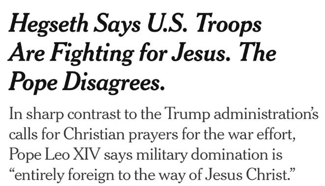 While Trump and Hegseth wrap this illegal war in scripture, Pope Leo has been busy reminding the world that domination is “entirely foreign to the way of Jesus Christ,” that good cannot come from abuse of power, and that Jesus rejects the prayers of those who wage war.