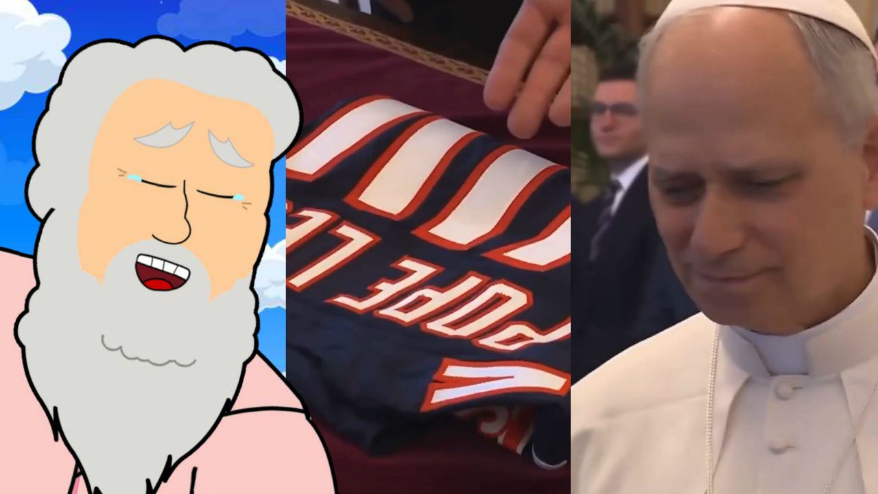 So this year, to make up for what he did, he showed up with a Chicago Bears jersey that said “Pope Leo” on it.