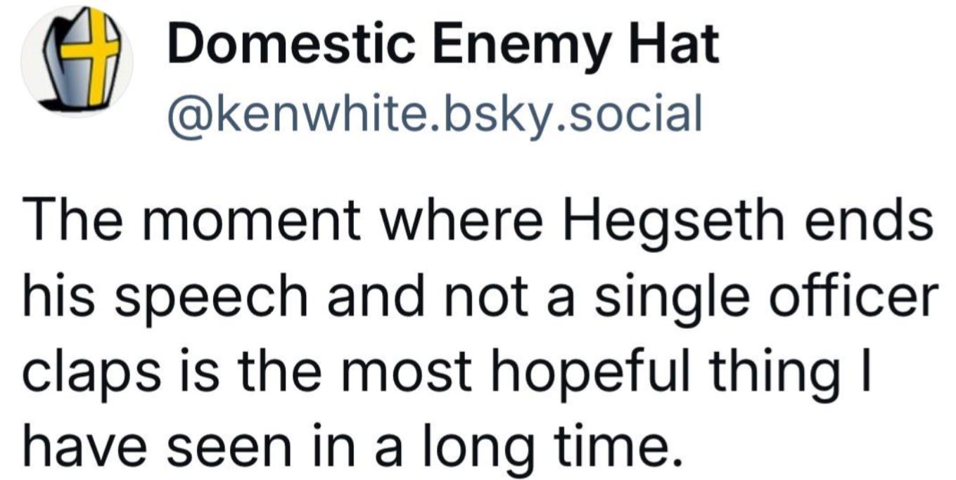 The silence was deafening! Hegseth made an utter fool of himself trying out his comedic skills but it all fell flat. The military brass has seen clowns before and they weren’t having it.