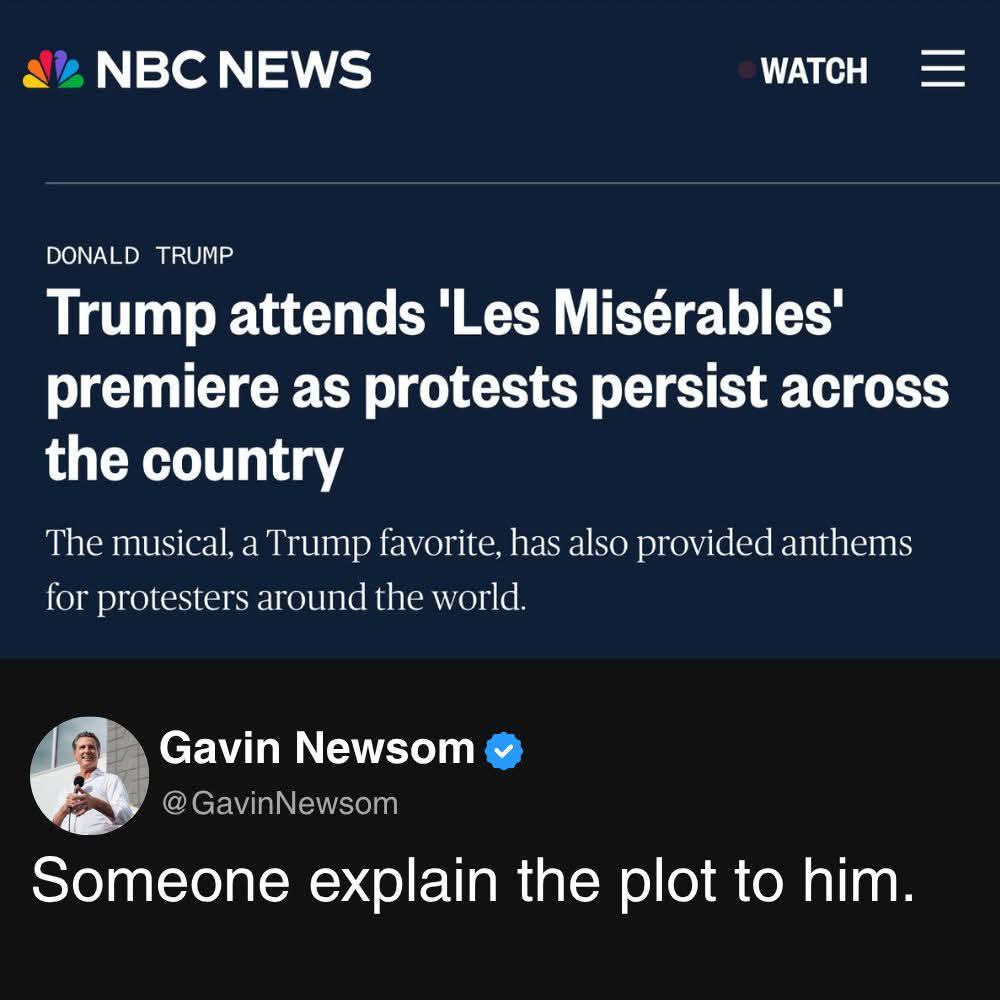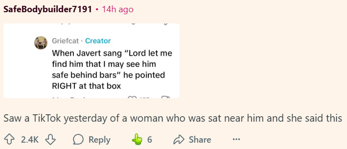 Lo, reports have also surfaced that during the performance of Les Mis, that as the actor playing Javert sang, “Lord let me find him that I may see him safe behind bars,” and pointed directly at Trump’s box.
