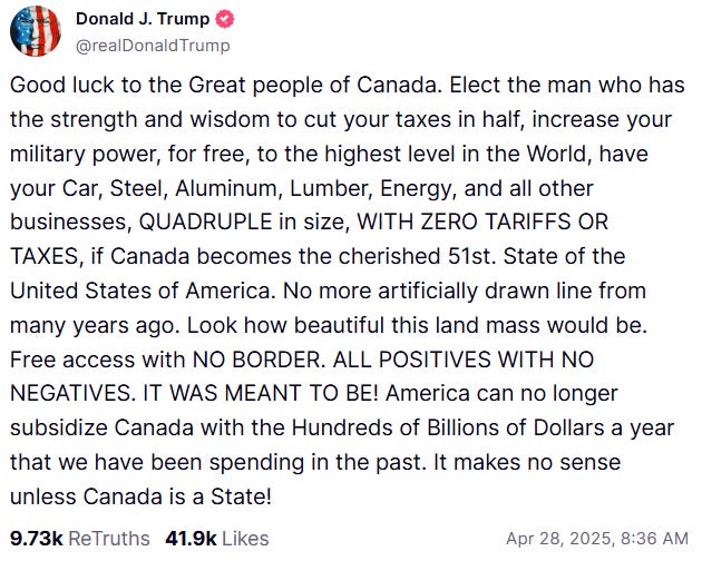 Yesterday was election day in the land of Canada. Naturally, the foul knave Donald Trump did what he does best. The fool started ranting about how Canada should "become the cherished 51st state." He couldn’t possibly have done more to hurt the Conservative party in Canada. Truly, a masterwork of stupidity. BEHOLD!