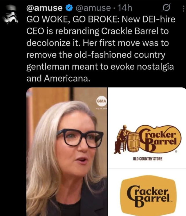 NAY! It’s the Cracker Barrel logo change. Buckle up, humans! These fragile crackers are crumbling.