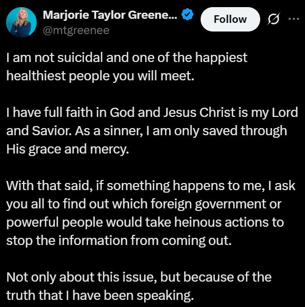 Marjorie Taylor Greene suggested she might be killed (and it made to look like a suicide) because she is calling for the Epstein files to be released.