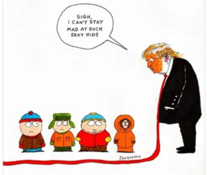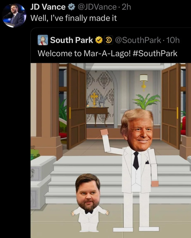 Lo, South Park showed JD Vance as Trump’s tiny tuxedoed lapdog, a personal fluffer / errand boy who is always at the ready to lube up Satan’s asshole.