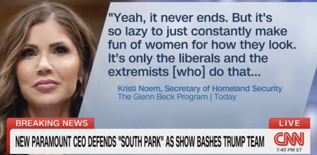 Noem is not introspective enough to know or care that South Park's commentary is not about physical beauty. It is about a superficial facade that cannot hide the cruel, grotesque nature of who she has become in service of an evil, racist cause.