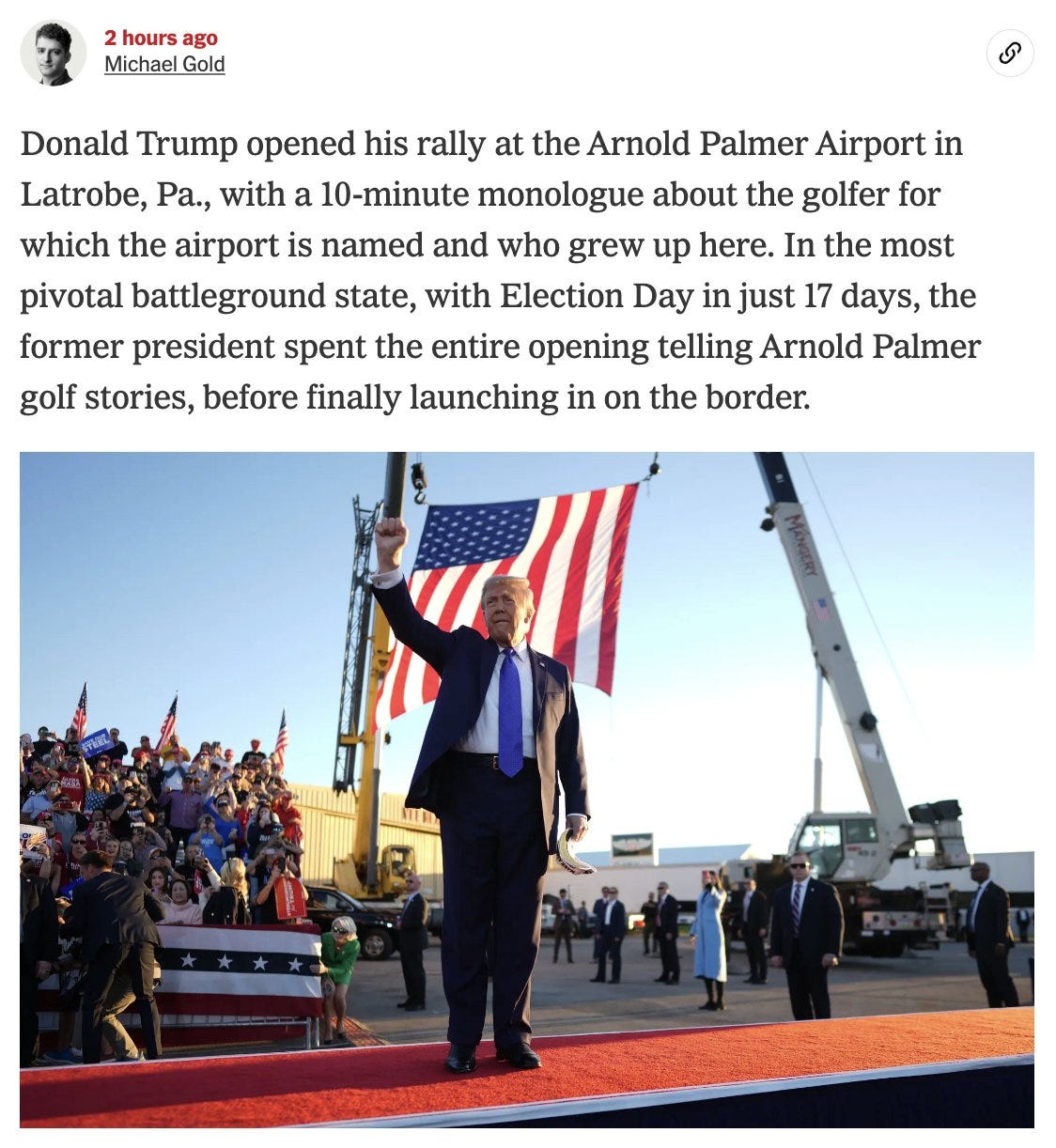 At a time when most candidates would be talking about the issues, Donold went off on a rant about dead golfer Arnold Palmer (who died in 2016 at 87), because he was from Latrobe.