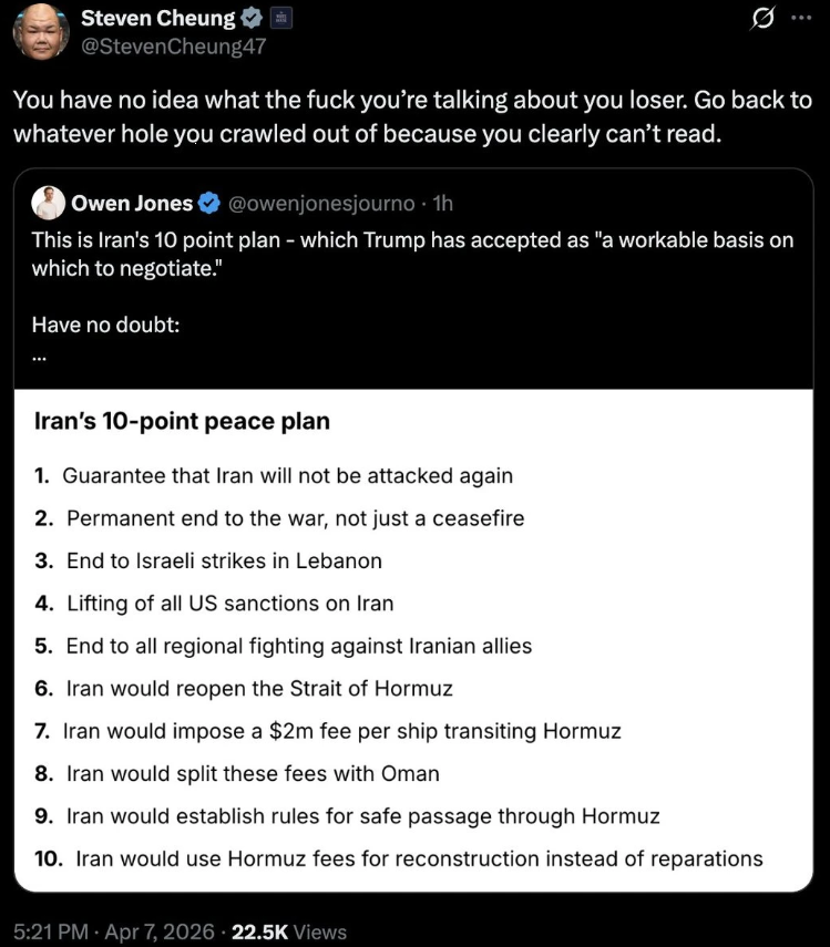 Iran’s Supreme National Security Council put out a statement framing the ceasefire as a “crushing defeat” for Trump after his genocidal threats.