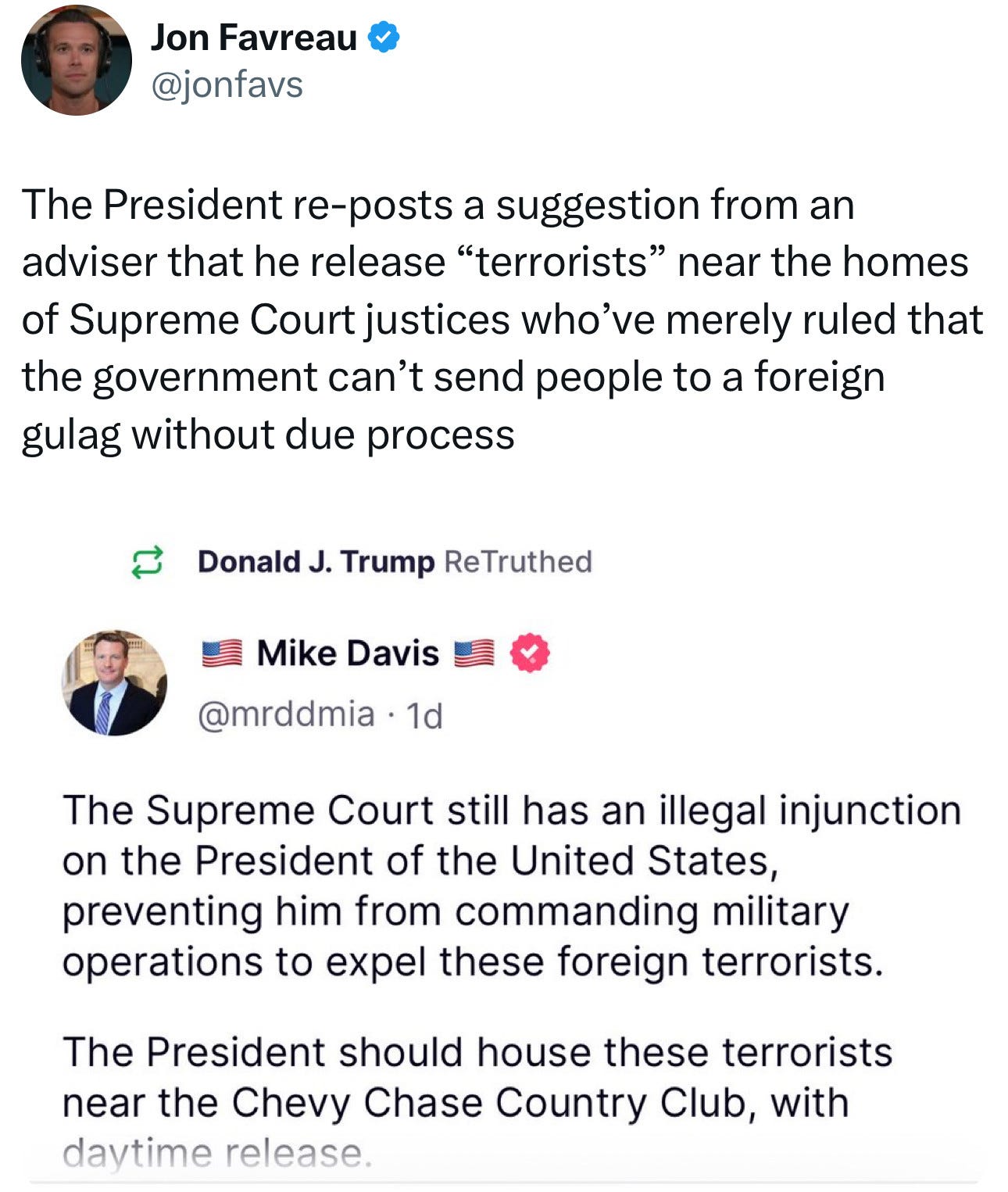 Deranged Donold also reposted a plan to release terrorists into the neighborhoods of Supreme Court justices.