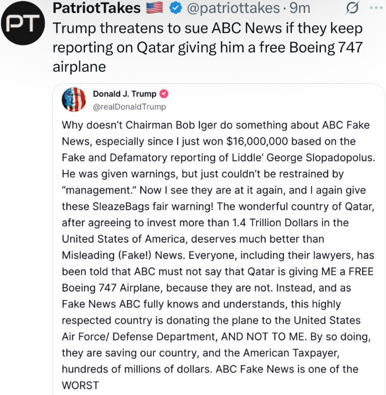 After ABC revealed that Qatar gifted him a $400 million flying palace, crybaby Donold responded the only way he knows how, by threatening to sue. Not because it was false. Because it’s true.