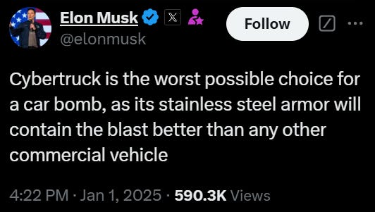 A Tesla Cybertruck exploded outside Trump’s Las Vegas hotel yesterday, leaving the driver dead and seven others hurt. While authorities seek answers, Elon Musk’s own fans wonder: was this fiery act meant as a message unto him?? God investigates!