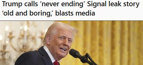 That’s MAGA for “I’m panicking.” Of course, it’s not boring. It’s the biggest national security scandal that has ever occurred in the history of the United States and it’s not even close.