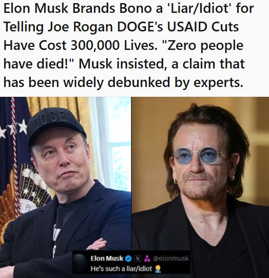 Bono said the DOGE cuts to foreign aid likely killed 300,000 children. He got this from Boston University researchers, who estimated that cuts to the USAID would quickly lead to 300,000 deaths, primarily children, due to factors like malnutrition, malaria, and pneumonia.
