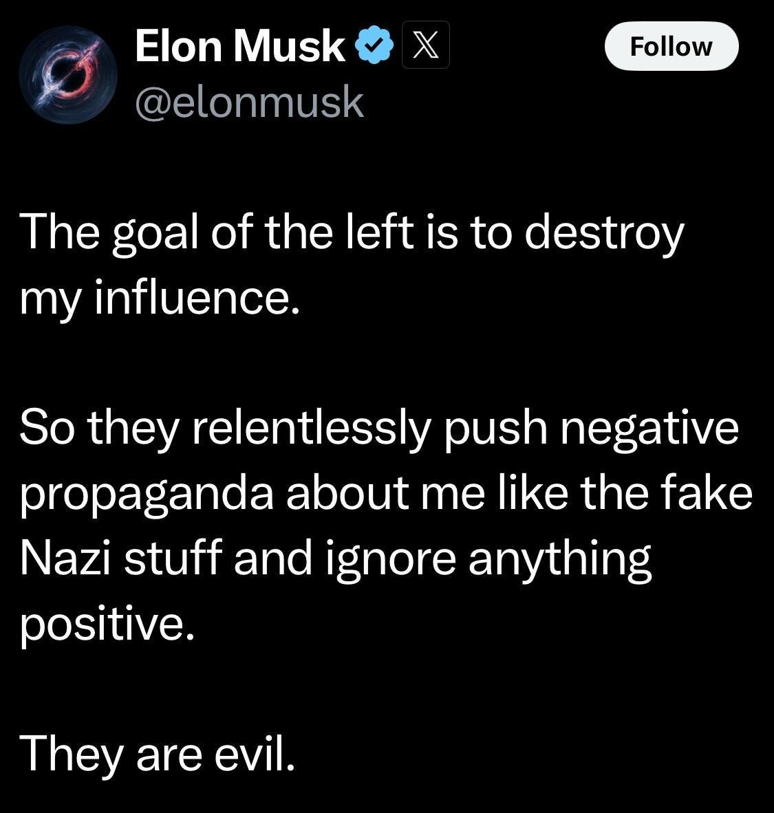 Paraphrased: "The Left pushes evil lies about me and ignores everything that's positive." I didn't know there was ANYTHING positive about the Muskrat. I certainly can't think of anything. Does he donate money to eradicate disease or feed starving children? Does he fund a university in downtown Budapest? Haven't heard anything about anything like that.