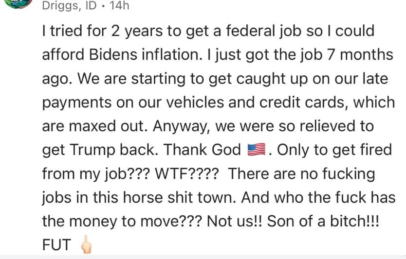 This Trump supporter got fired and somehow summoned the courage to post “FUT" with a middle finger emoji. Oh, and thou art welcome!
