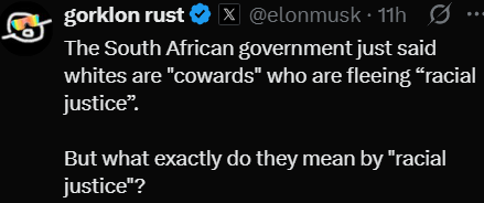 He cannot comprehend that the descendants of colonizers might owe reparations to the people they brutalized. The man is out here defending literal apartheid and even his robot doesn’t want any part of it.