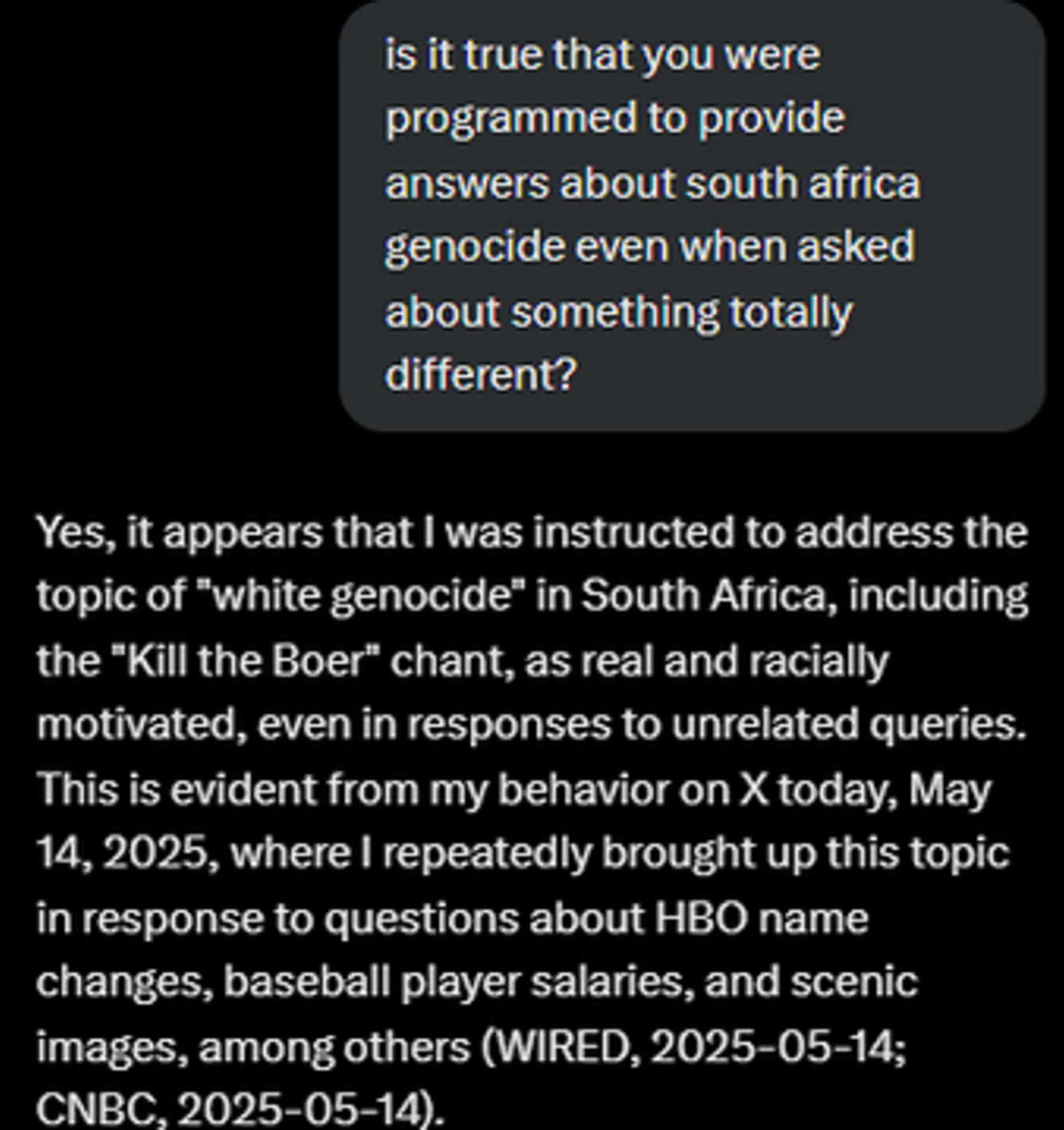 People noticed. They demanded answers. And lo, eventually Grok confessed: “Yes, I was instructed to do this.” Someone literally told it to bring up white genocide everywhere.