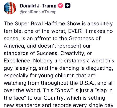 Racist-in-Chief Donald complained as always. And by doing so, he shockingly admitted that he watched Bad Bunny instead of the Kid Rock / Turning Point USA halftime event for white supremacist pedophiles.