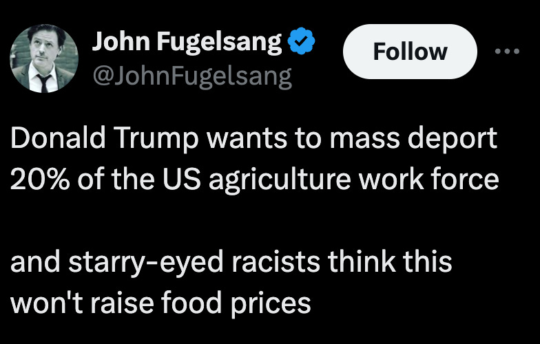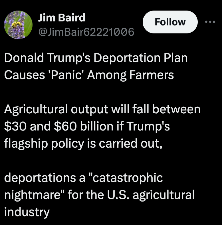 To many in his uninformed and racist voter base, they hear about the proposal and think it’s a great idea. What they don’t realize is how it’ll affect - among many things - their food supply.