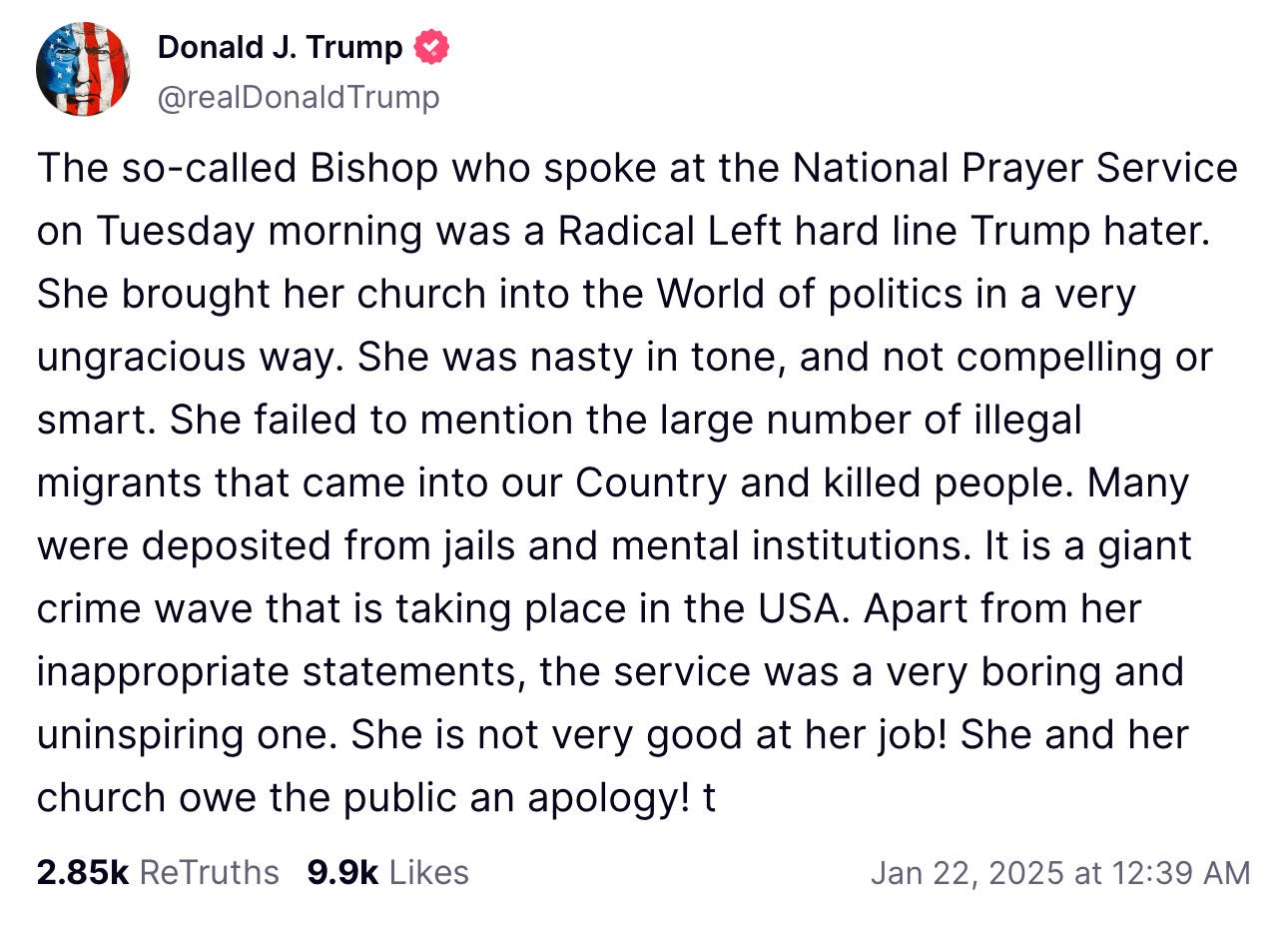 Lo, behold the moment when mercy clashed with cruelty, exposing the fragile egos of fascist charlatans everywhere. At the National Prayer Service, Bishop Mariann Edgar Budde delivered a heroic, spontaneous act of rebellion—a sermon calling for mercy for immigrants and LGBTQ+ people. Naturally, Donold and his cult are big mad. Let’s break it down.
