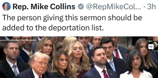 To be clear, the person giving the sermon was born and raised in the USA. So what he’s really advocating for here is deporting U.S. citizens for practicing their First Amendment rights.