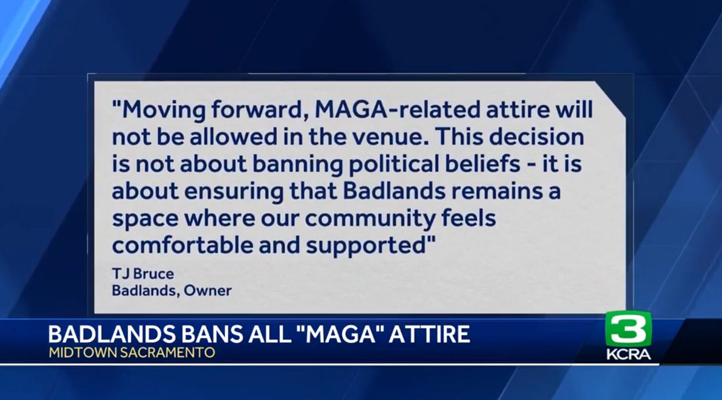 “Moving forward, MAGA-related attire will not be allowed in the venue. This decision is not about banning political beliefs — it is about ensuring that Badlands remains a space where our community feels comfortable and supported.”