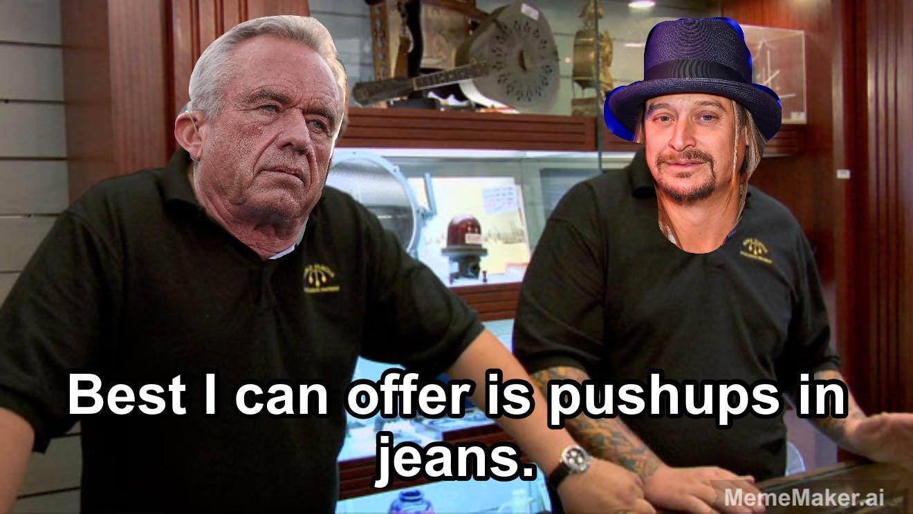 Meanwhile, Kid Rock and RFK Jr. released a gay porn video of themselves naked and working out. RFK Jr. got into a hot-tub wearing jeans. (EDITOR’S NOTE - IMAGES OF VIDEO DELETED FOR BEING TOO EXPLICIT)