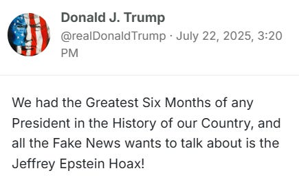 Lo, the truth has been revealed. Trump was told in late May that his name appears in the Epstein files multiple times.
