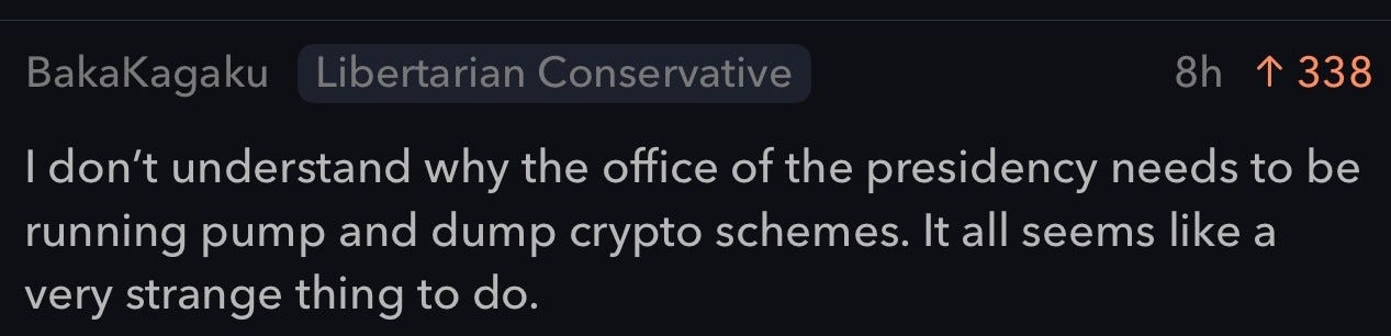 HAHAHAHAHAHA! Oh, I can’t stop laughing. First, Donold leaves his supporters out in the cold—literally. Then, they get hit with the double whammy of his crypto grift falling apart in real time. It was quite a weekend for schadenfreude. Buckle up, buckaroos!