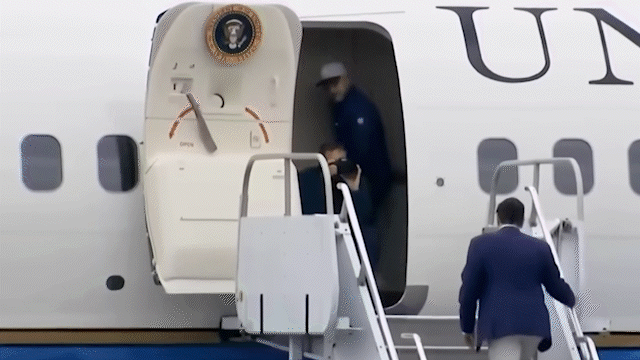 Behold a moment from this weekend, when Taco Supreme Leader, so bloated with delusion and drunk on power, tripped while walking up the stairs to Air Force One.