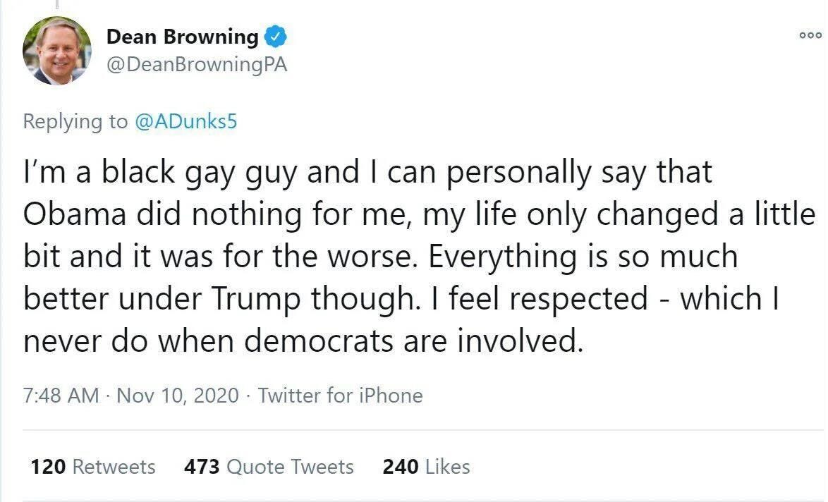 Dean Browning, a former GOP congressional candidate, straight-up forgot to switch accounts before tweeting as his “Black gay guy” persona who mysteriously loved Donald Trump.