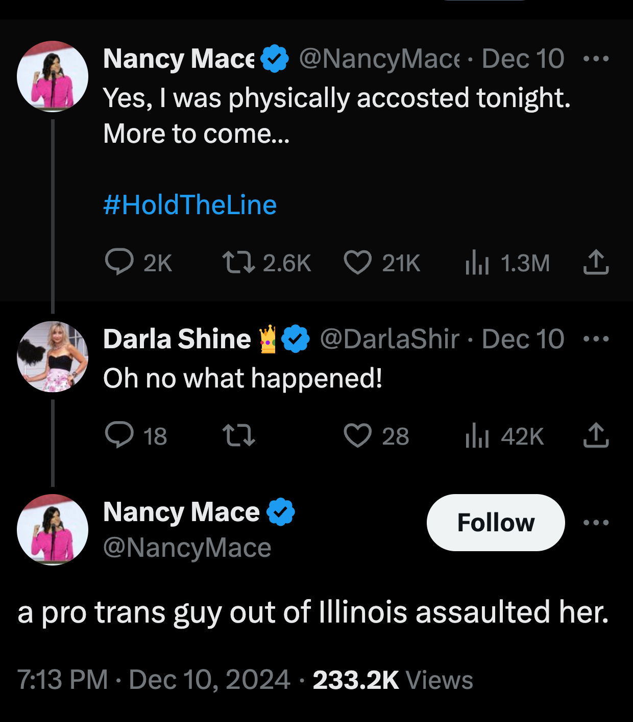Let’s recap: She claimed she was “physically accosted” by James McIntyre, a transgender rights advocate, at the Capitol. But witnesses said the interaction was just… a handshake. A HANDSHAKE, folks! Nancy, baby, this is why people don’t take you seriously.