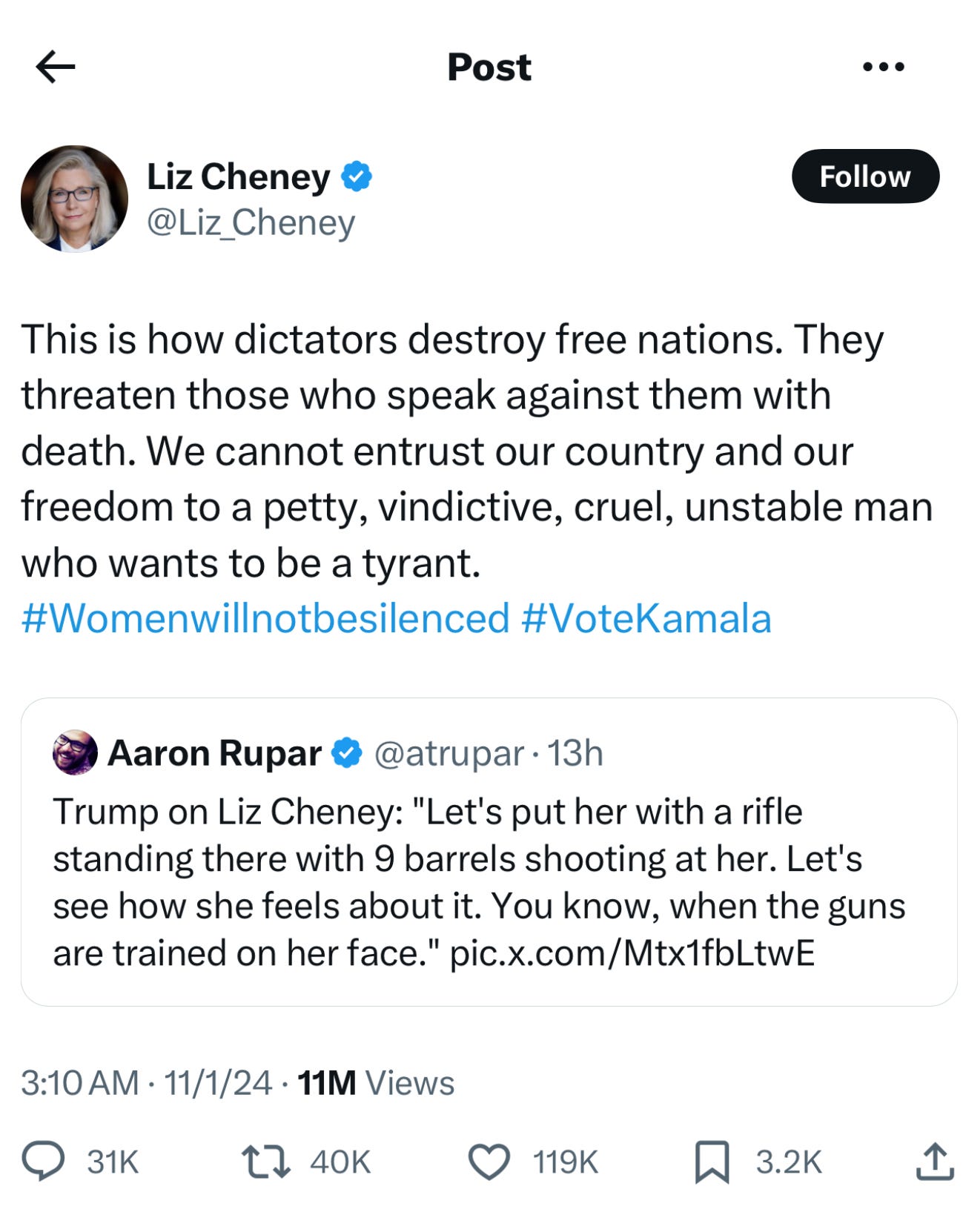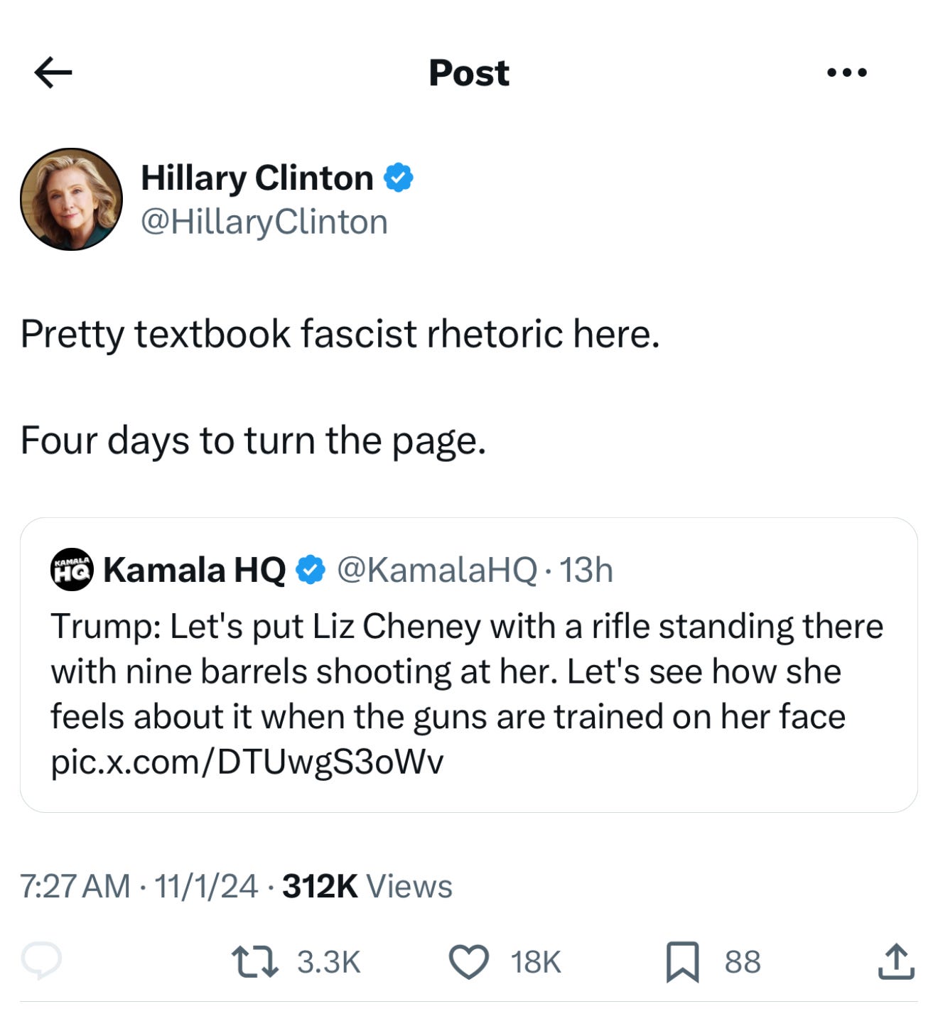 “She’s a radical war hawk. Let’s put her with a rifle standing there with nine barrels shooting at her, OK? Let’s see how she feels about it. You know, when the guns are trained on her face.”