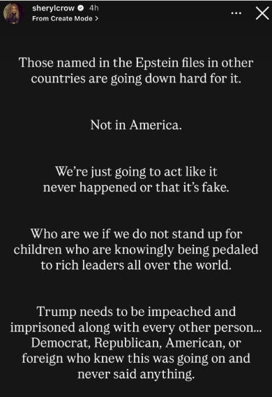 Sheryl Crow called for President Epstein to be impeached. Bless her for using her platform to speak out like this!