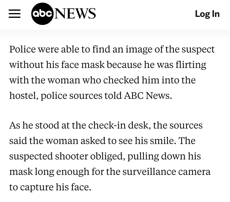 And you know what’s truly wild? The only reason we even have a good look at this guy is because a hostel worker flirted with him. She asked him to pull his mask down during check-in—not to verify his identity, mind you, but to see his face.