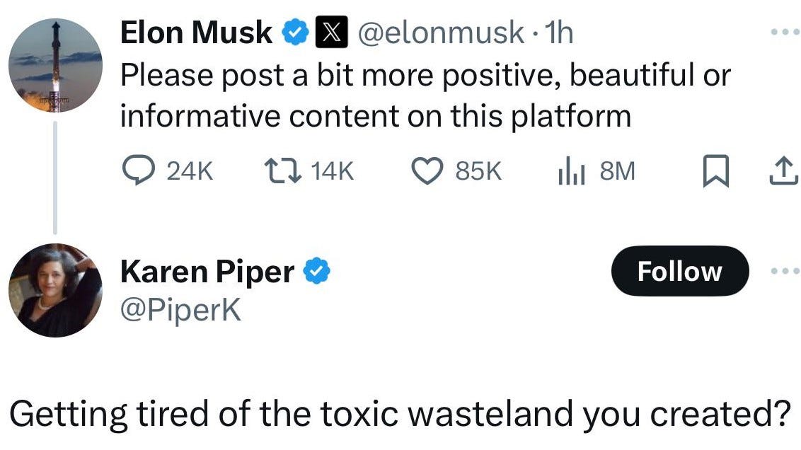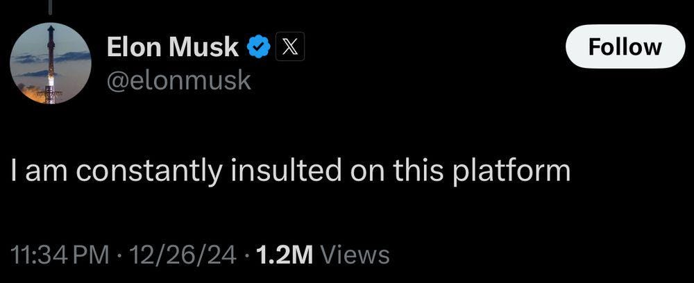 On the platform he paid $44 billion for, only to speed-run turning into a raging dumpster fire of toxicity, I shit thee not, Elon Musk posted this: