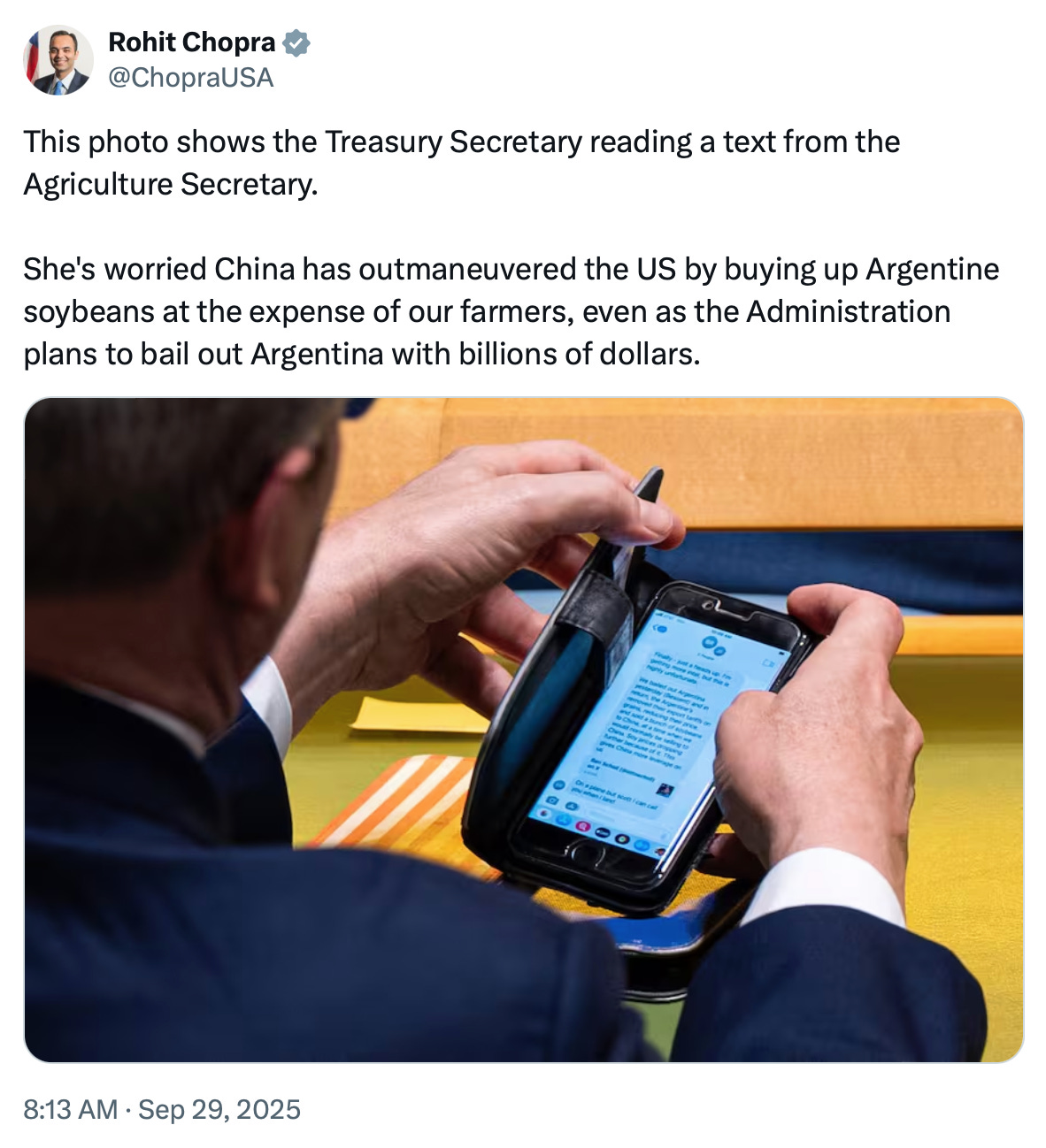 On his glowing screen: US Agriculture Secretary Brooke Rollins admitting that Trump bailed out Argentina, only for them to slash prices to sell soybeans to China.