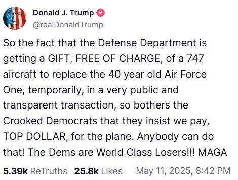 That’s the actual Constitution, which Trump swore to uphold at the Inauguration, and then last week said that he didn’t know if he had to do that. This is a $400 million jet, from an oil monarchy, with no approval from Congress, for personal use.