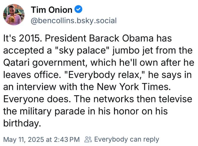 Is…is getting a $400 million private jet gifted to himself from Qatar the result of one of his Tariff 'deals' we keep hearing about?