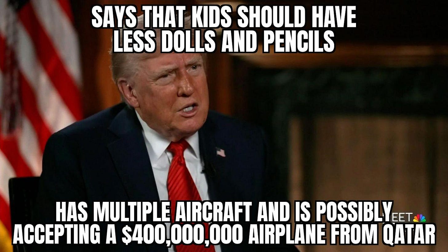 THE VILEST CRIMINAL TO EVER LIVE said your kids should have fewer dolls and pencils, and then announced he’s getting a $400 million private jet as a personal gift from Qatar’s royal family.