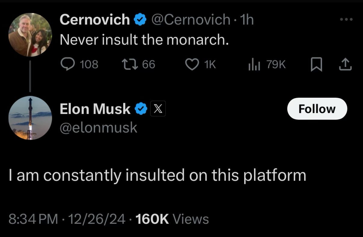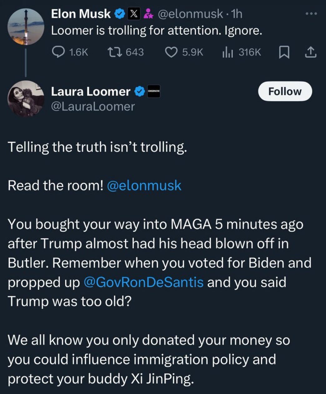 It all started when xenophobic racist / far right bastard Laura Loomer accused Musk of betraying MAGA over his support for H1-B visas.